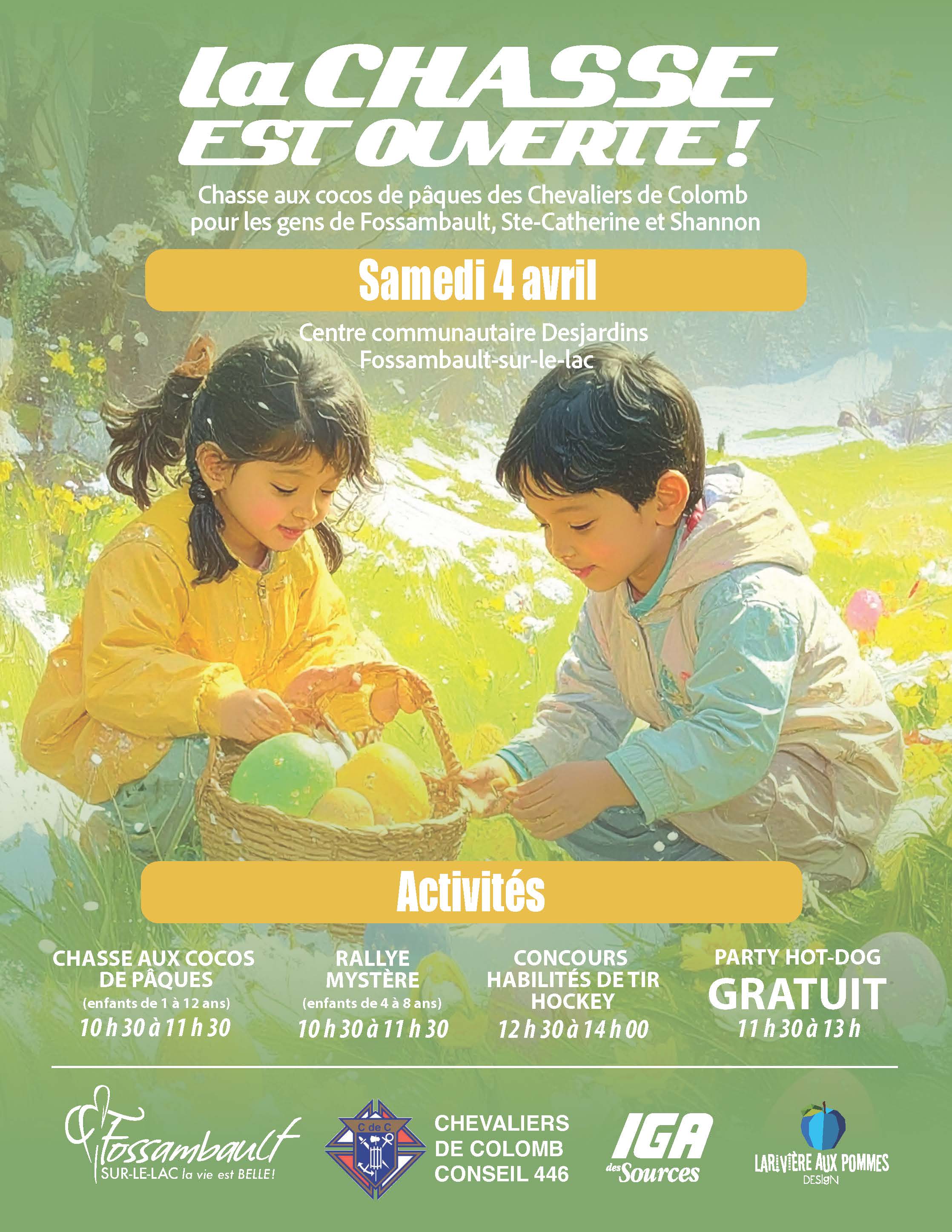 Les Chevaliers de Colomb du Conseil 446 invitent les familles de Fossambault‑sur‑le‑Lac, Sainte‑Catherine‑de‑la‑Jacques‑Cartier et Shannon à participer à une chasse aux cocos de Pâques festive et conviviale, ce samedi 4 avril.