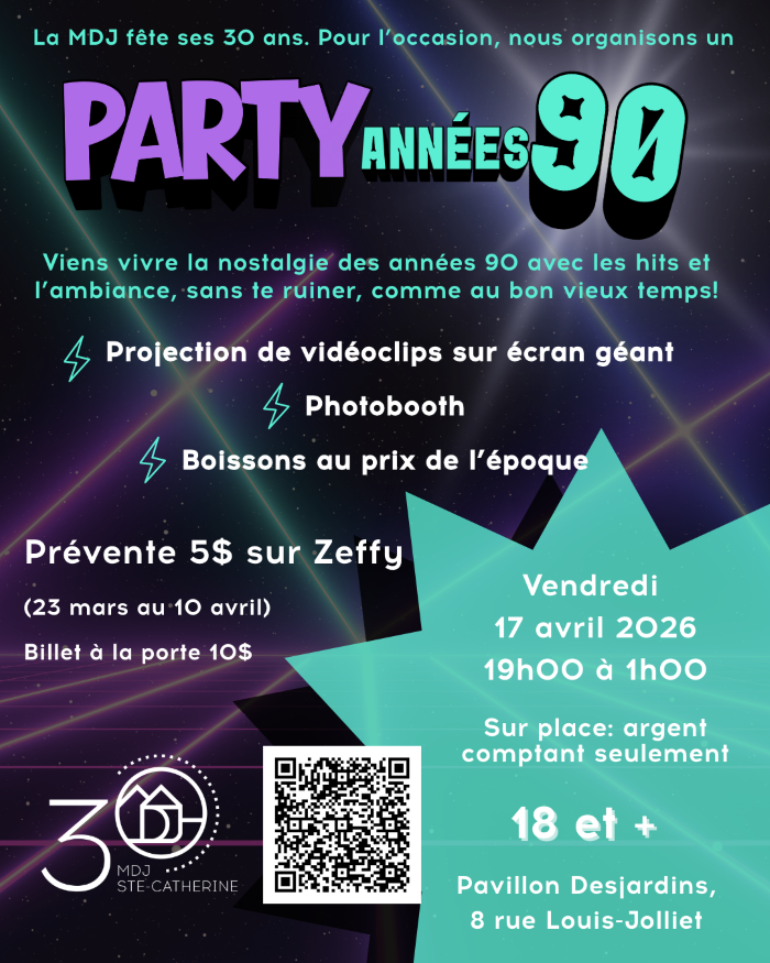 La Maison des jeunes de Sainte‑Catherine-de-la-Jacques-Cartier célèbre ses 30 ans et invite la population à replonger dans l’ambiance des années 90 le temps d’une soirée festive, le vendredi 17 avril, de 19 h à 1 h, au pavillon Desjardins!