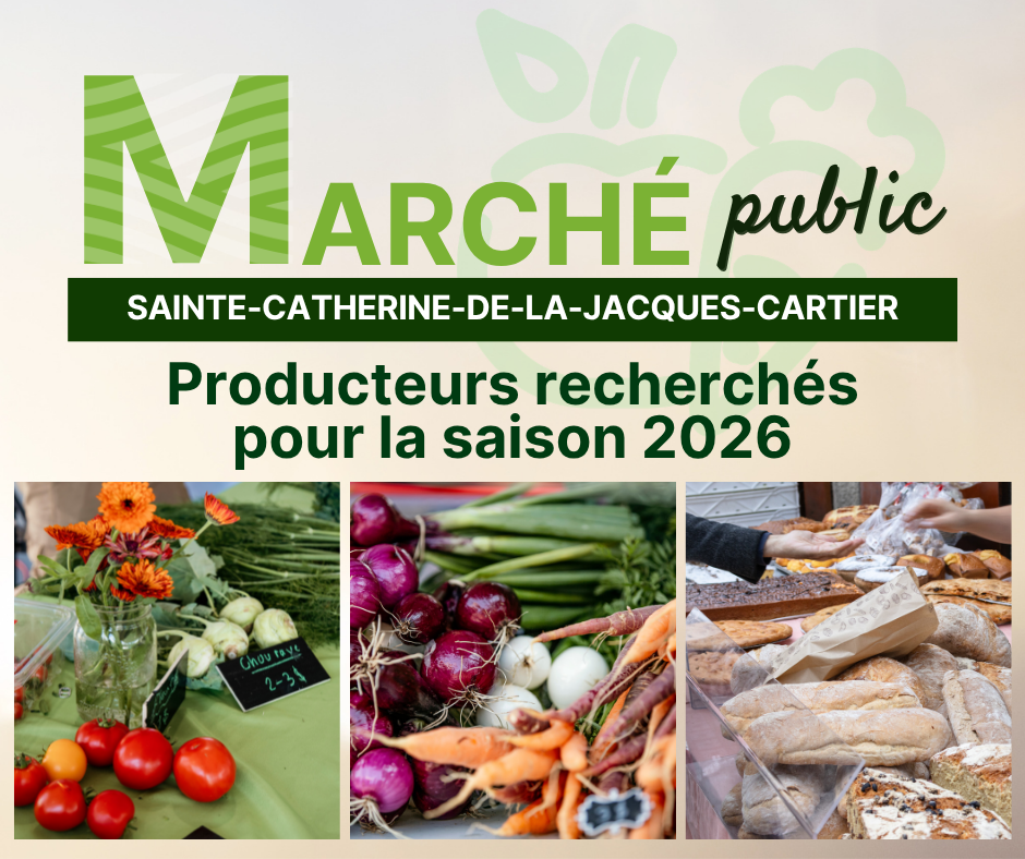 Le Marché public de Sainte‑Catherine‑de‑la‑Jacques‑Cartier sera de retour à l’été 2026 et accueillera, comme chaque année, des producteurs et artisans locaux au parc du Grand‑Héron.