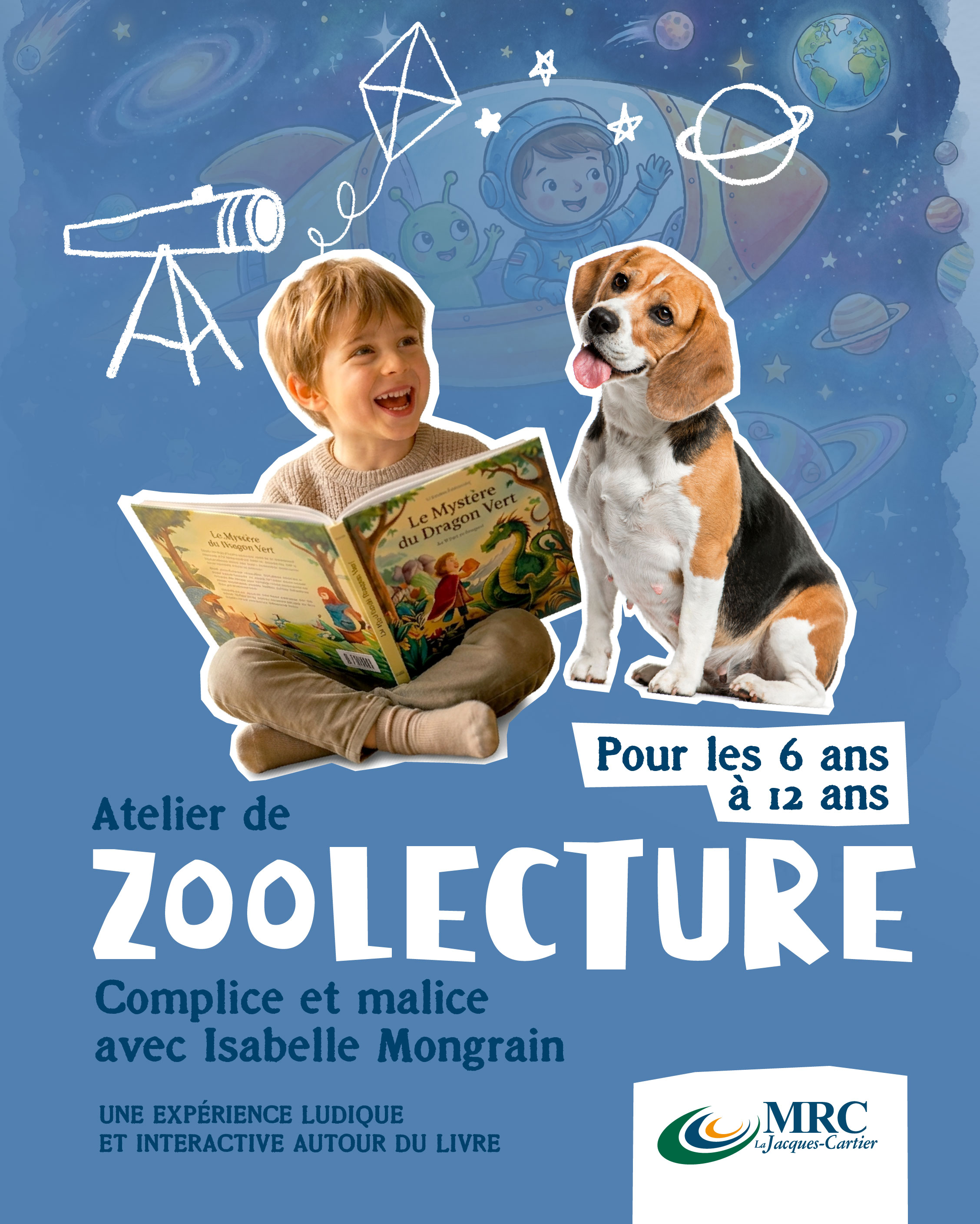 La MRC de La Jacques‑Cartier propose des ateliers de zoolecture animés par Complice et Malice – Isabelle Mongrain, offerts dans plusieurs bibliothèques du territoire.