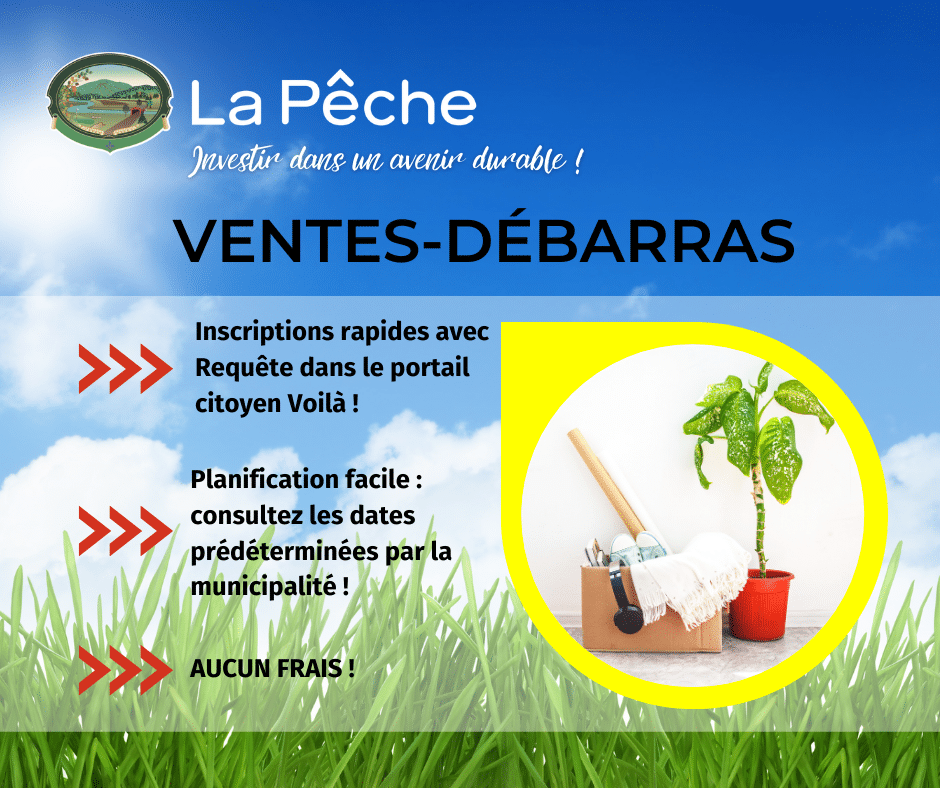 Inscription Vente-Débarras 👕👗⚽🏒🛹🛴🎮 ⚡ Inscrivez-vous dès maintenant pour la prochaine période et bénéficiez d’une publicité gratuite! 📌 2 et 3 mai 2026 ✨ Les adresses inscrites seront ajoutées au plus tard le 1er mai, à 15 h. 🛍️ Consultez la carte intéractive pour voir les adresses inscrites. |