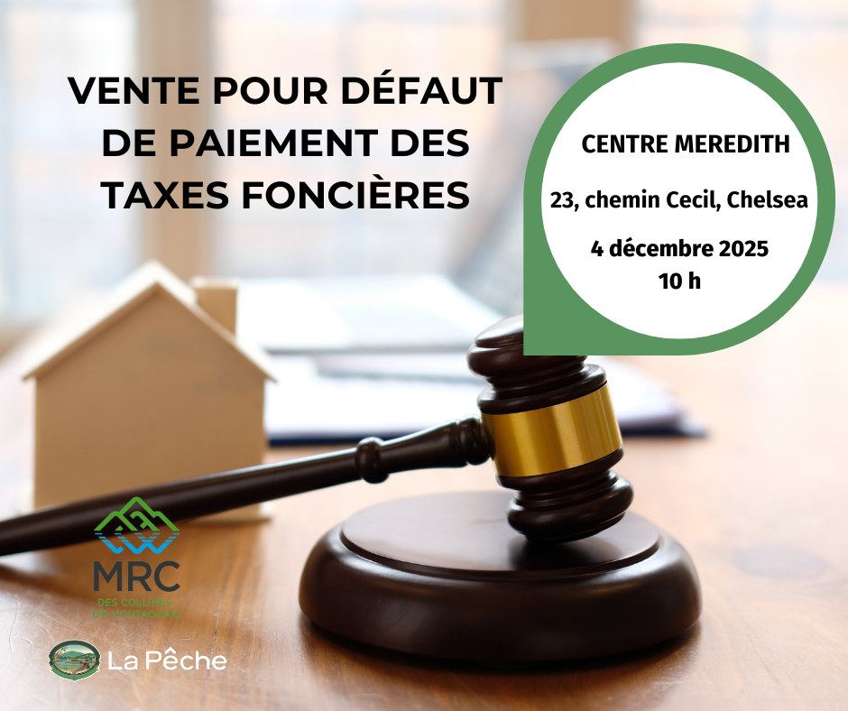 VENTE POUR DÉFAUT DE PAIEMENT DES TAXES FONCIÈRES Selon l’article 1026 du Code municipal du Québec, des immeubles seront vendus à l’enchère publique pour défaut de paiement des taxes ou autres impositions dues sur ces immeubles, incluant les frais engagés avant la vente. Cette vente publique aura lieu au Centre Meredith, situé au 23, chemin Cecil, à Chelsea, le jeudi 4 décembre 2025 à 10 h. Vous retrouverez les détails et la liste des propriétés en cliquant ici! |