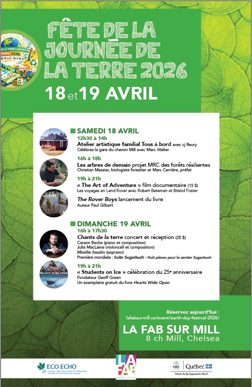 Venez célébrer le Jour de la Terre lors du Festival du Jour de la Terre présenté par Eco Echo et La Fab! Un rendez‑vous vibrant où l’art, la nature et l’aventure se rencontrent pour inspirer, émerveiller et rassembler la communauté autour de notre lien avec l’environnement. Retrouvez toutes les informations en cliquant ici. |