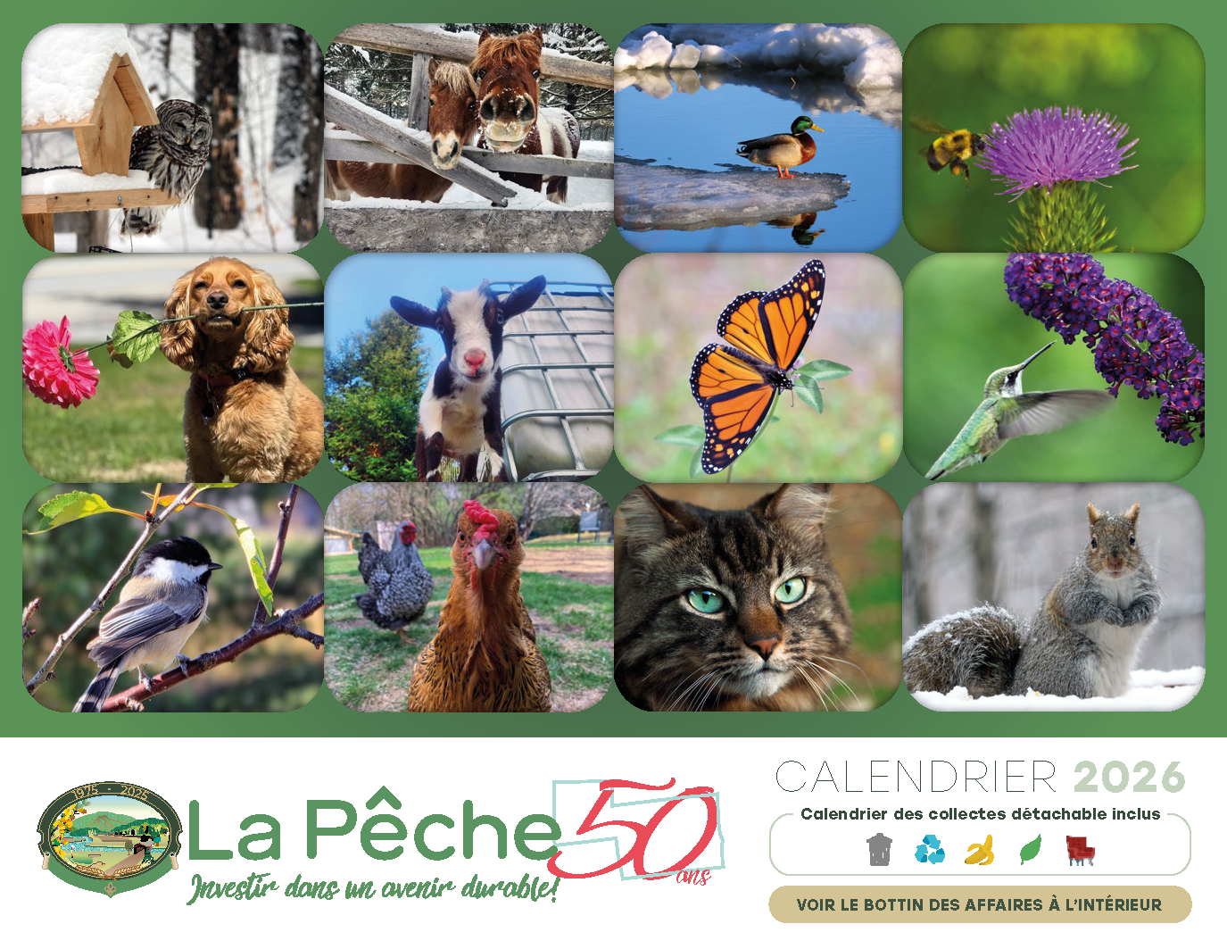 Nous avons le plaisir de vous annoncer que la conception du Calendrier municipal 2026 est achevée, et qu'il partira sous peu à l'impression, en compagnie de la nouvelle version du Bottin des affaires de La Pêche! Un immense merci à tous les participants et nos plus sincères félicitations aux gagnants de notre concours de photo! Les douze clichés ayant reçu le plus de votes du public orneront votre calendrier pour l'année à venir. | Merci à ces talentueux photographes pour avoir capturé la vie animale de La Pêche : 📷 Kamille Alie Poirier Les versions papiers (Calendrier et Bottin) seront disponibles aux citoyens vers la mi-décembre. Restez à l'affût de nos prochaines publications! Nous vous indiquerons où et quand vous procurer votre exemplaire numérique ou papier en primeur. Calendrier municipal | Municipalité de La Pêche |