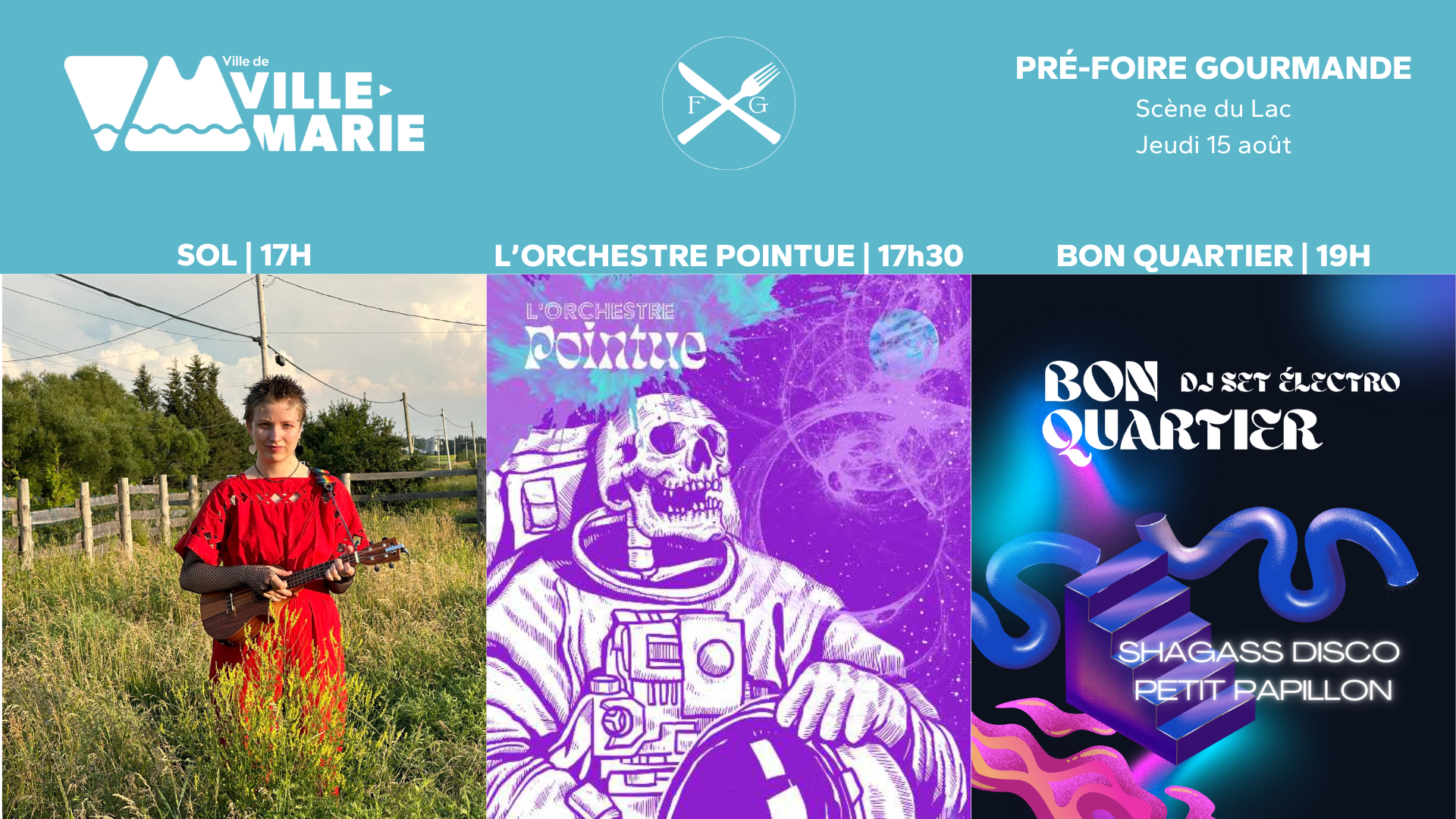 17h30 - L'Orchestre Pointue : Groupe de rock de Ville-Marie, fondé en 2019, le trio est composé des musiciens Martin Bernard (Grenouille) à la basse, Pascal Bibeau (Bibs) à la batterie et Dominic Bérubé (Marionnette Pointue) à la guitare et à la voix. Ils cumulent à eux l'équivalent de plus de 75 ans d'expérience de scène lors de centaine de spectacles, partout au Québec, en Ontario et en Eur : Groupe de rock de Ville-Marie, fondé en 2019, le trio est composé des musiciens Martin Bernard (Grenouille) à la basse, Pascal Bibeau (Bibs) à la batterie et Dominic Bérubé (Marionnette Pointue) à la guitare et à la voix. Ils cumulent à eux l'équivalent de plus de 75 ans d'expérience de scène lors de centaine de spectacles, partout au Québec, en Ontario et en Europe.